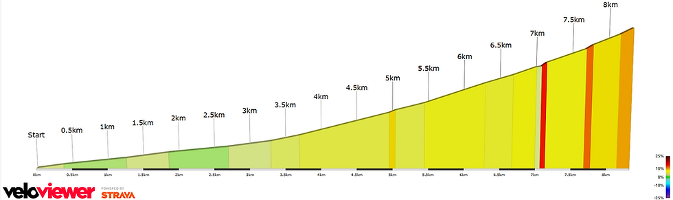 Le dernier kilomètre sera la partie la plus difficile de l'ascension, avec près de 8,3 % de pente moyenne jusqu'à l'arrivée.