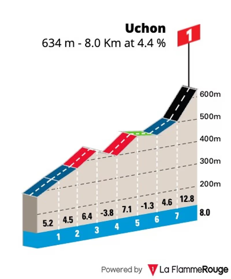 Sans photo, c'est un finish pour puncheurs grimpeurs. Il faudra avoir les jambes pour encaisser l'avant dernière montée avec le Côte de la Croix de la Libération, mais surtout les 7 premiers kilomètres irréguliers du final vers Uchon, avant de faire parler son punch sur le dernier kilomètre à près de 13 % de pente.