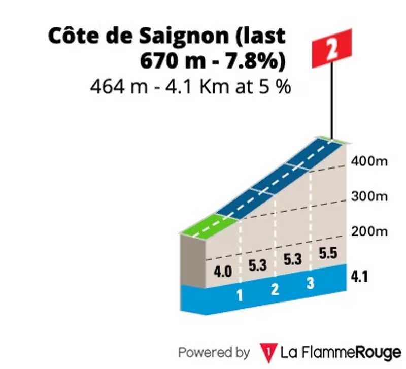 C'est une bosse à ne pas mettre de côté, avec ses 2,7 kilomètres de long à 5,2 % de pente moyenne, qui plus est avec plusieurs relances.