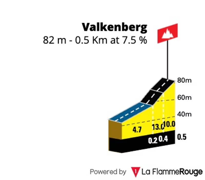 Car derrière, ils enchaîneront 2 autres monts avant d'arriver au pied du Valekenberg au kilomètre 191. Puis de poursuivre avec le Berg Ten Houte au kilomètre 204.