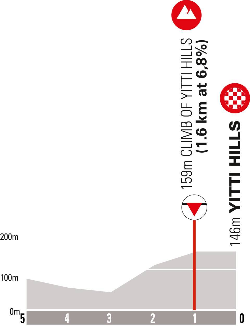 Mais attention, car au sommet de la montée de Yitti Hills il restera encore 1 kilomètres de course, globablement plat, et avec un demi tour sur route large à 700 mètres de l'arrivée.