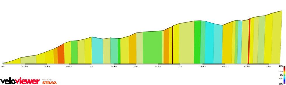 C'est un segment difficile mais pas insurmontable. Long de 3,1 kilomètres, la portion est très irrégulière et affiche près de 3,8 % de pente moyenne. Au sommet les coureurs passeront sur l'unique pointage intermédiaire de ce chrono.